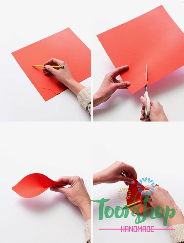 Tiếp theo, bạn đặt mẫu cánh hoa đã cắt lên trên giấy đỏ dùng bút căn ke theo mẫu và cắt theo đường vẽ. Để làm bông hoa bạn cần 3 cánh hoa lớn và 3 cánh hoa nhỏ. Bạn gấp ½ cánh hoa bên dưới vào nhau, và dùng bút chì đặt vị trí giữa mặt sau của cánh hoa cuộn cánh hoa tạo nếp cong.